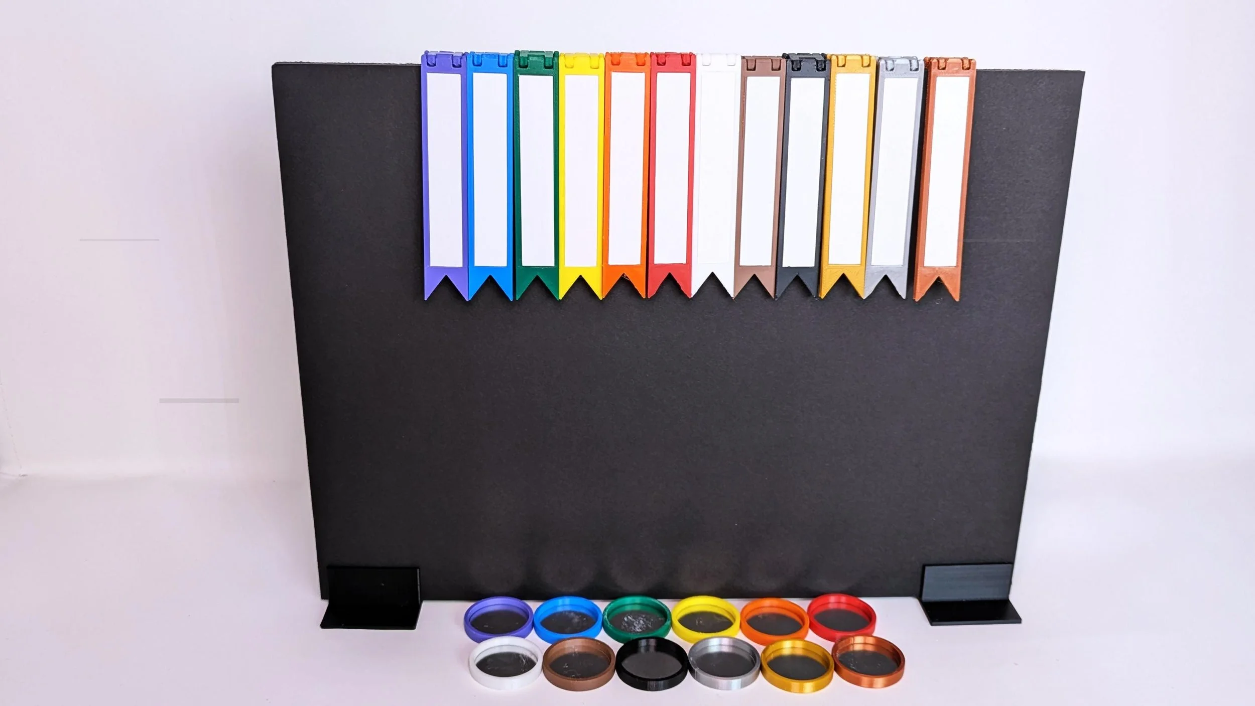 The set comes with 12 uniquely colored flags with matching bases for your minis. Each flag has a dry erase label to write names of PCs or mobs. The flags feature a hinge that fits multiple size DM Screens - the example in the photos is plain black foam board measuring approx ¼” thick. The flags also have embedded magnets to help keep them in place on your screen.