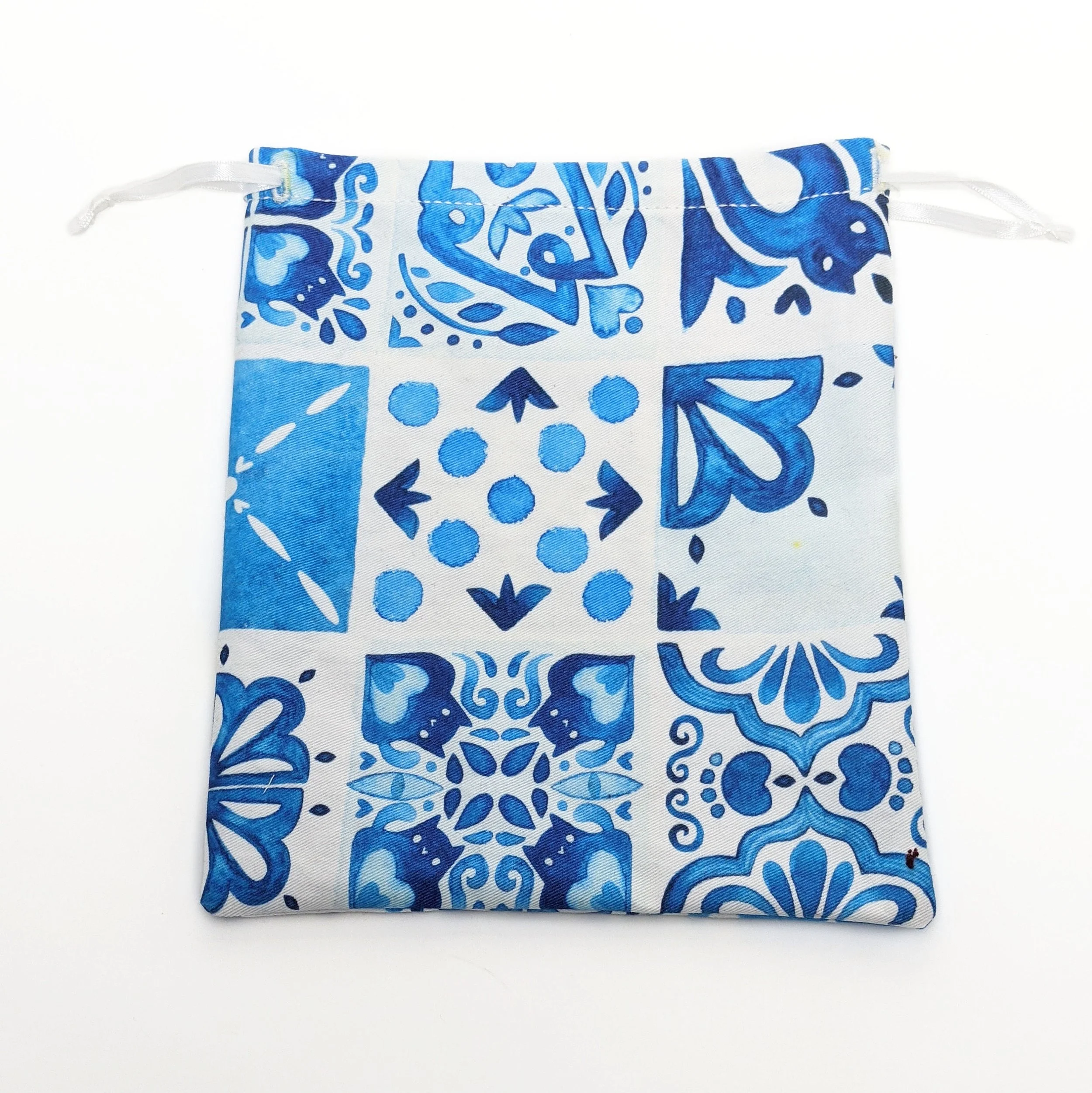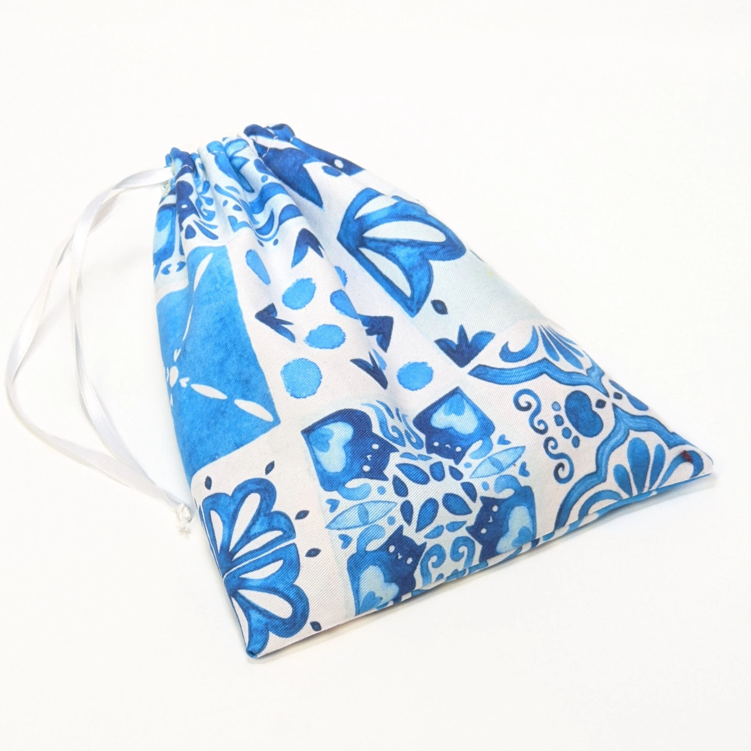 Our Azul Extra Bags are made of durable cotton twill in a specialty print. I used the original Azul bag as the basis so the Extra Bag has the same size and method of construction. All seams are serged for durability. The double ribbon closure allows the bag to be cinched.