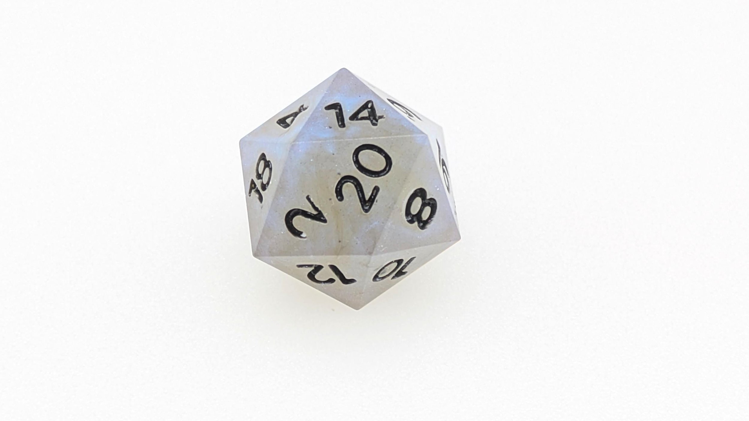 These dice are very, very lunar. The base is a light gray with a colorshift swirl that makes them look a little glowy. Perfect for a moon druid or anyone else obsessed with the moon!