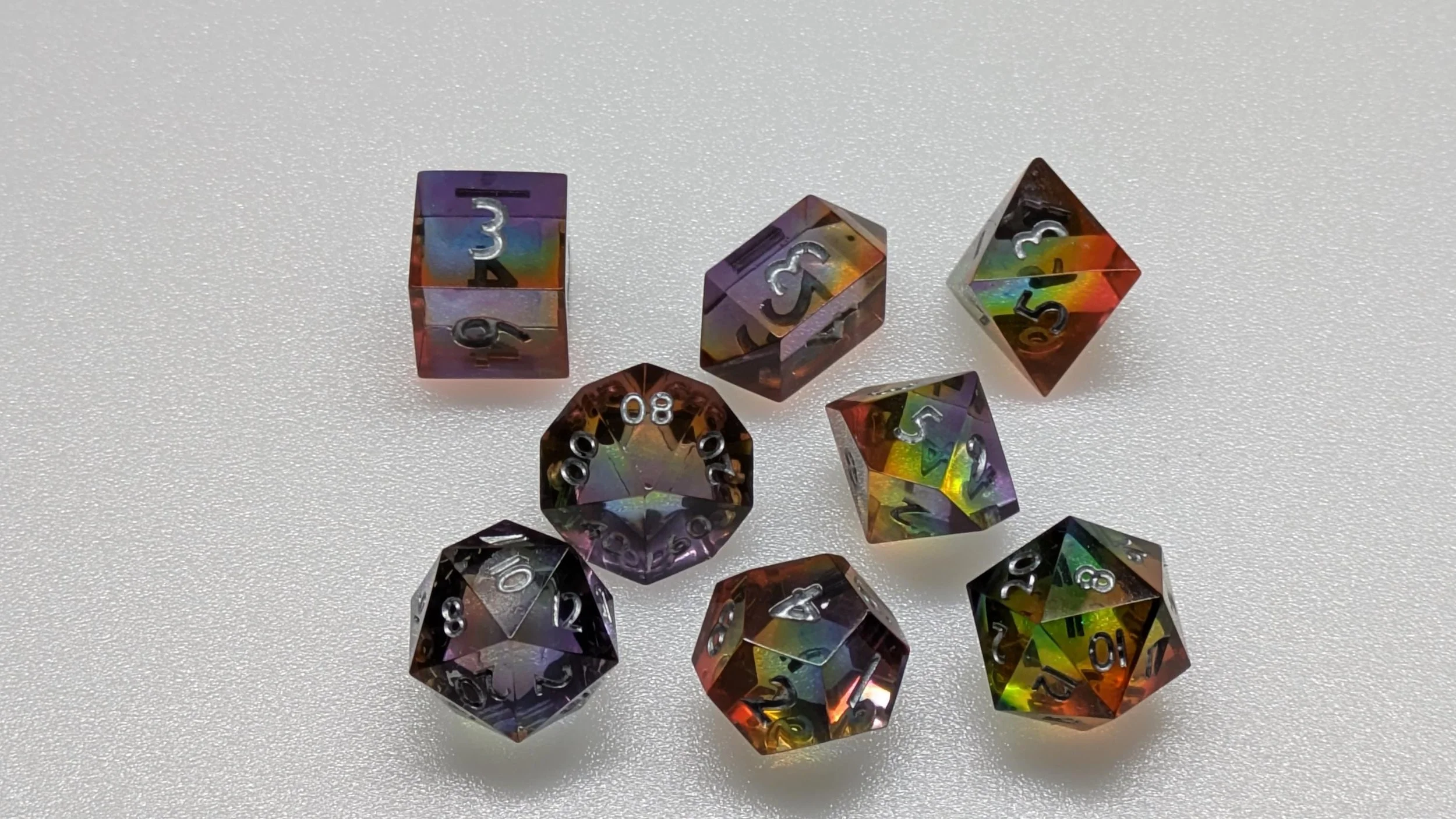 Rainbow with Silver Numbers B - Handmade set of 8 rpg dice